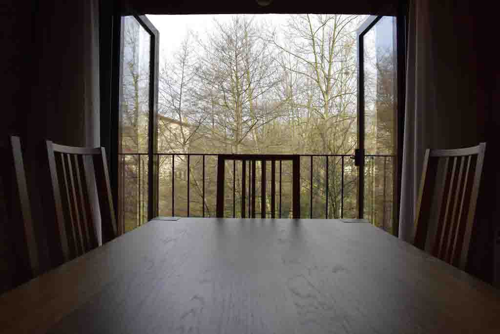 – Taula al costat del balcó amb vistes al riu.